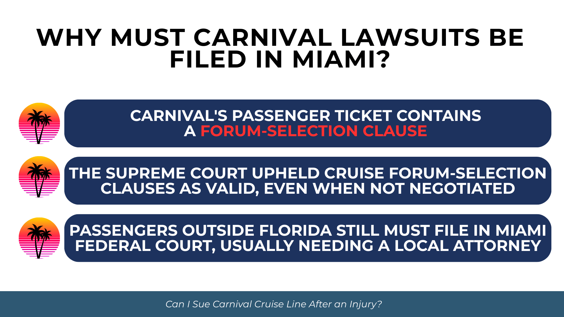If you were injured on a Carnival cruise, you will almost certainly need to file your lawsuit in Miami—regardless of where you live or where the ship sailed from.