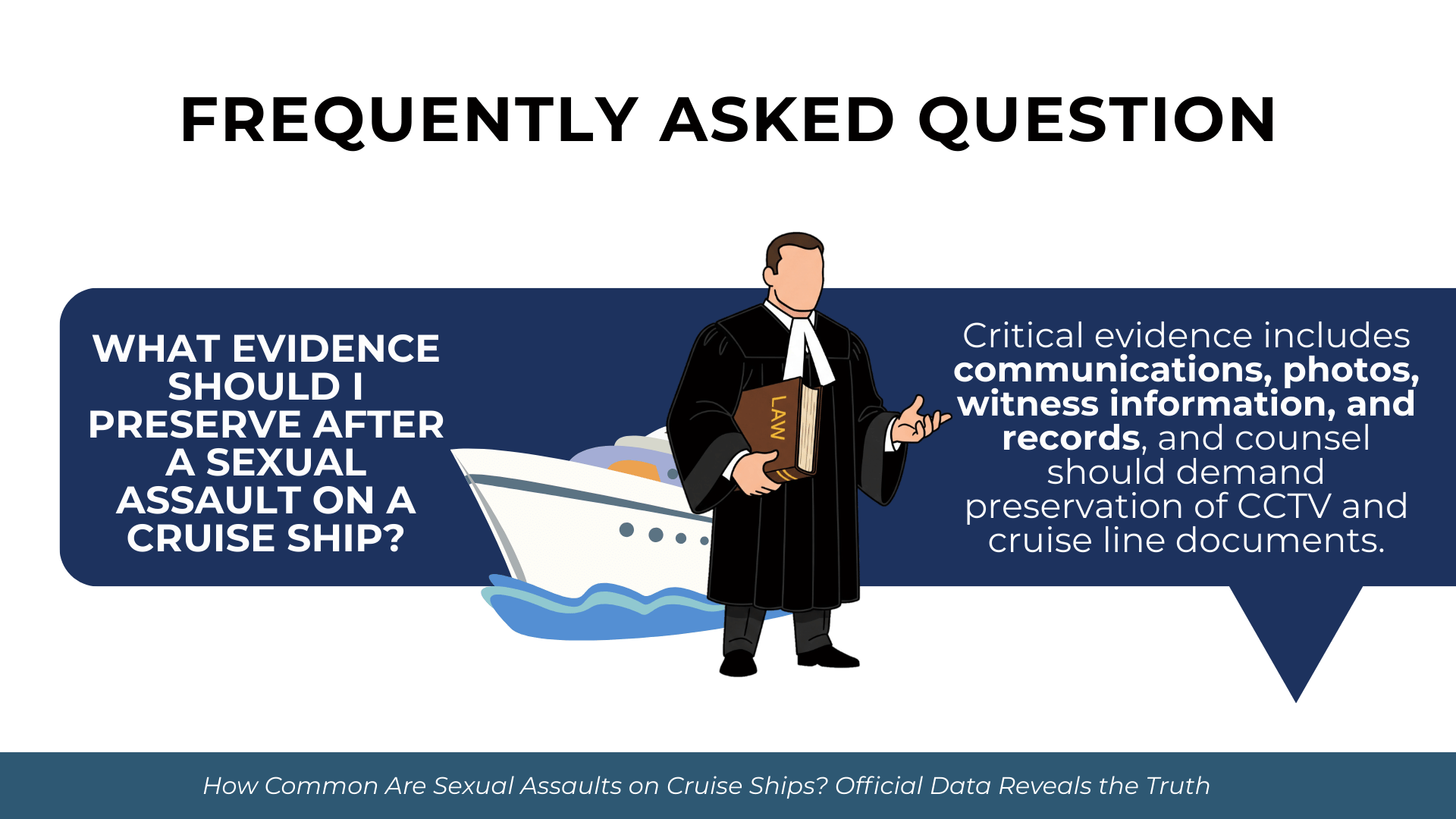 Critical evidence includes: any communications with the perpetrator before or after the assault; photographs of injuries, locations, or relevant conditions; names and contact information for witnesses; copies of all documents provided to ship security; medical records from any examination (onboard or ashore); and written correspondence with cruise line personnel. Counsel should immediately send the cruise line a formal preservation demand for CCTV footage, incident reports, crew records, and all internal documentation.