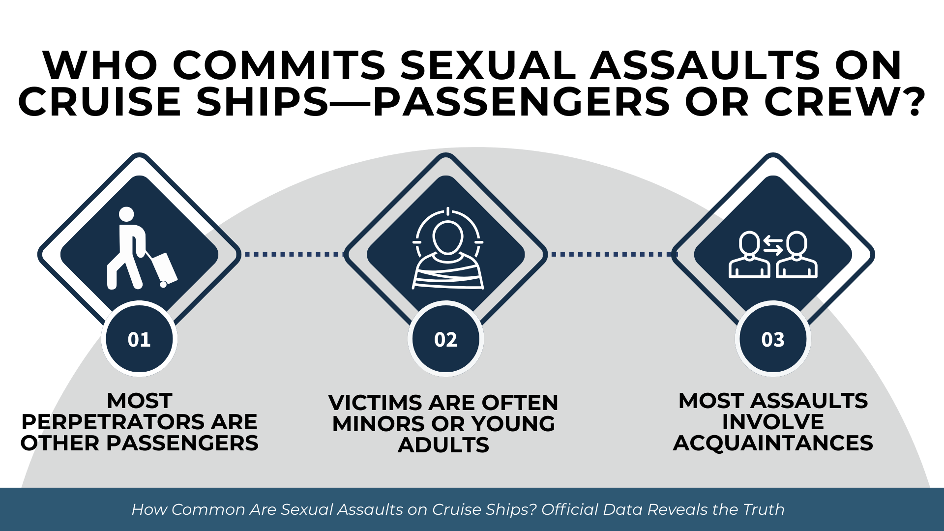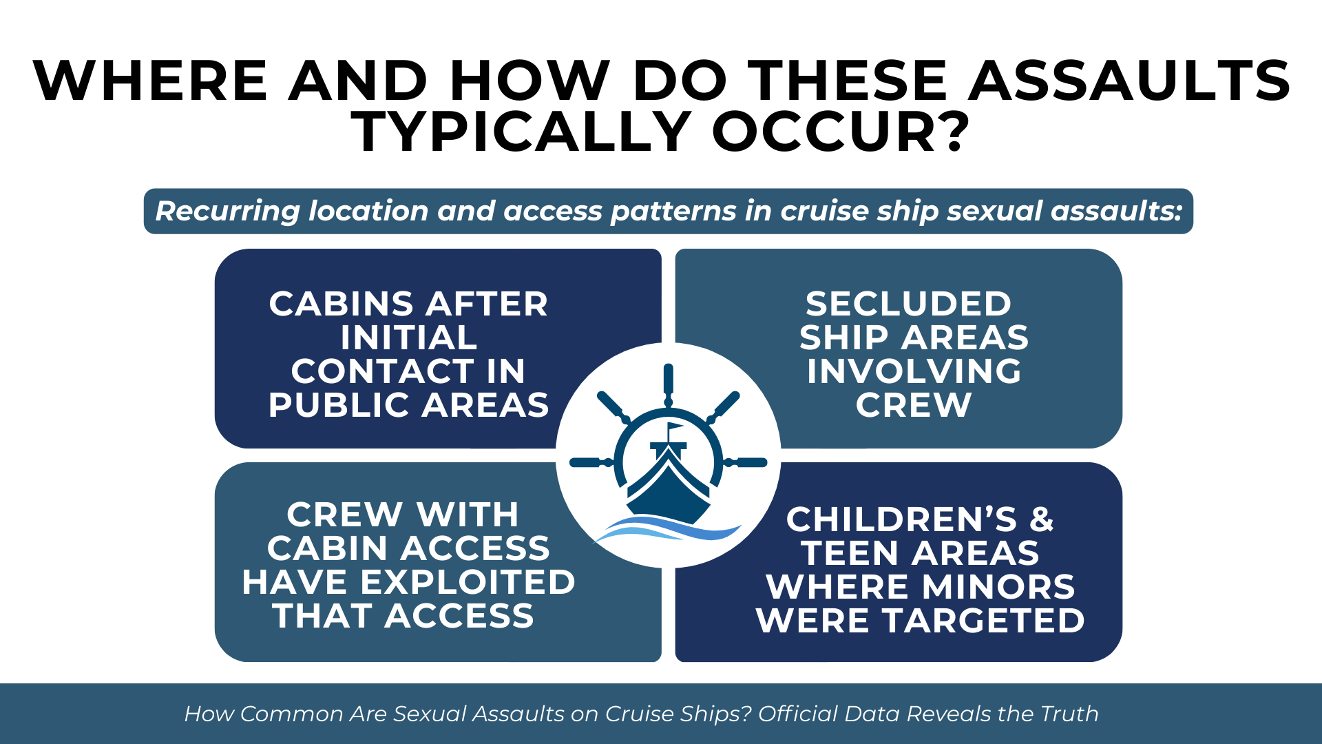 - Passenger cabins are the most common assault location, with many incidents occurring after initial contact in public venues. Perpetrators may follow or accompany victims to their staterooms.