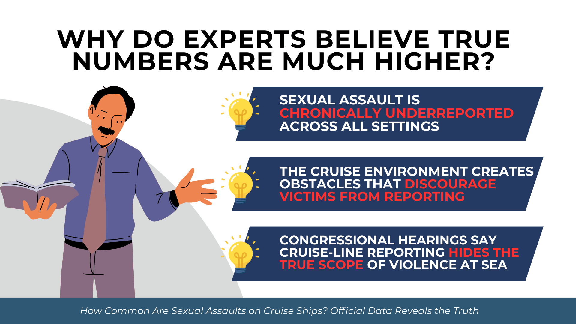 Official CVSSA statistics almost certainly understate actual sexual assault incidence on cruise ships. Every analysis of this data—from victim advocacy organizations to congressional testimony—acknowledges substantial underreporting that obscures the true scope of the problem.
