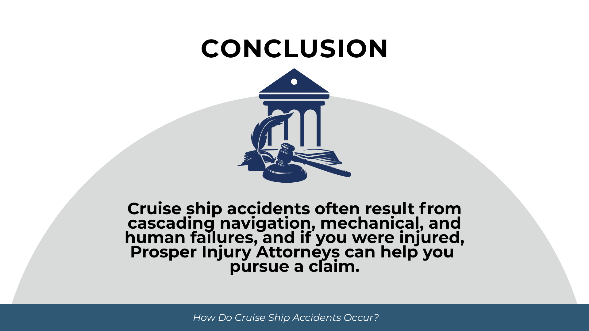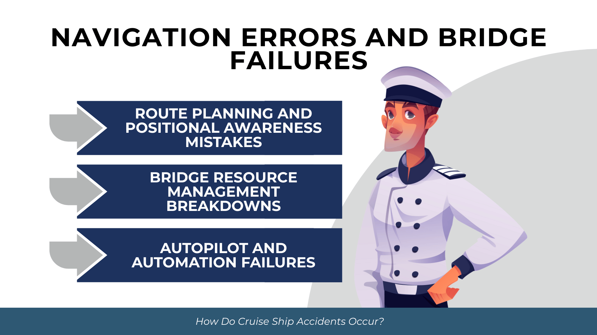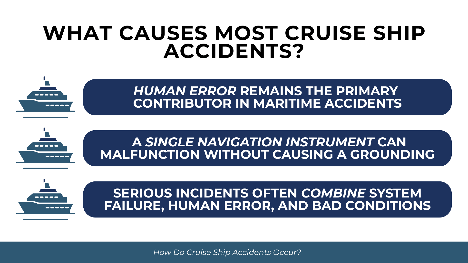 Cruise ships rely on advanced navigation technology and vigilant bridge teams. Errors in planning or execution can result in catastrophic incidents including groundings, collisions, and allisions with fixed structures.