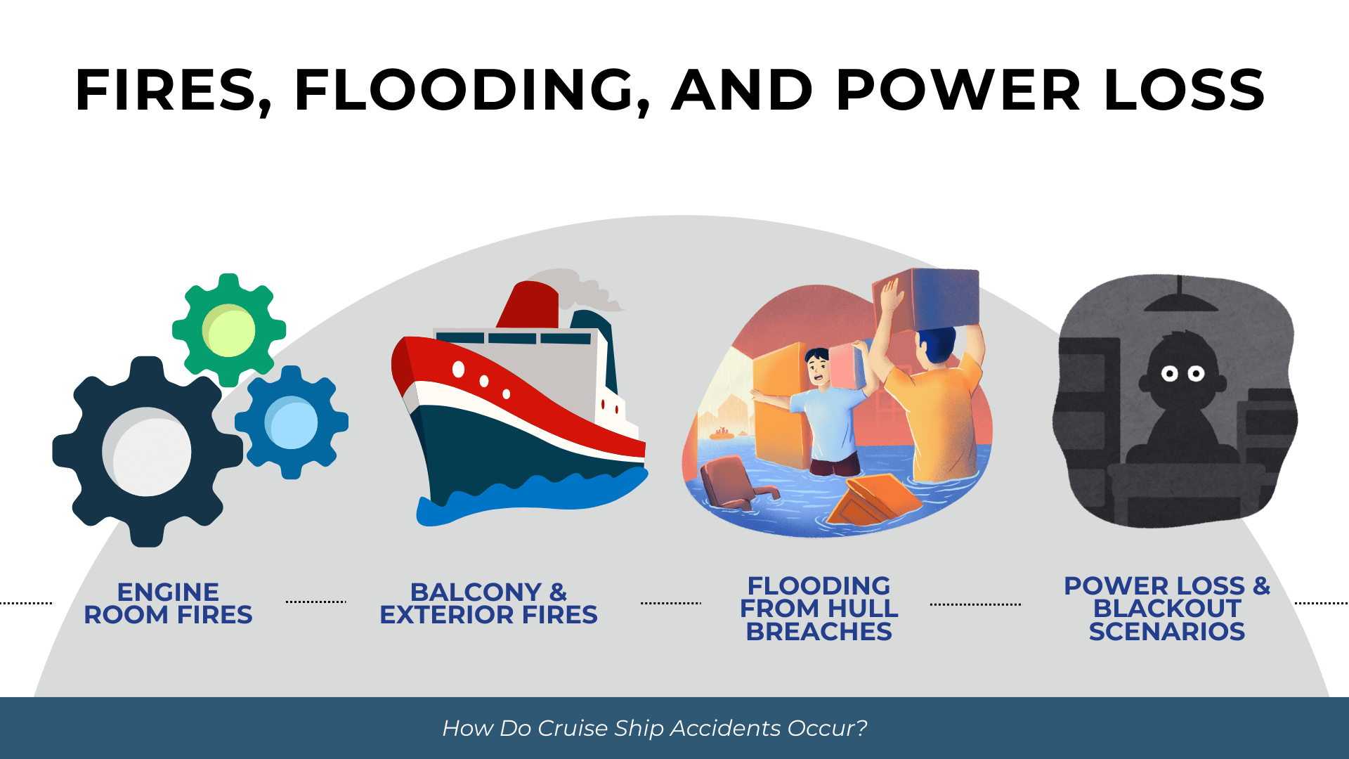 - Engine room fires. Fuel line failures or lubrication issues can ignite fires that knock out generators. The Carnival Triumph (2013) lost propulsion after an engine room fire left the ship adrift for days.