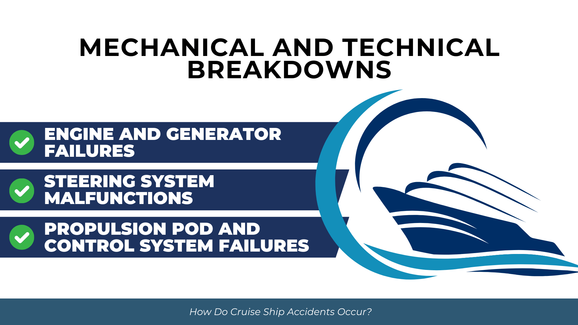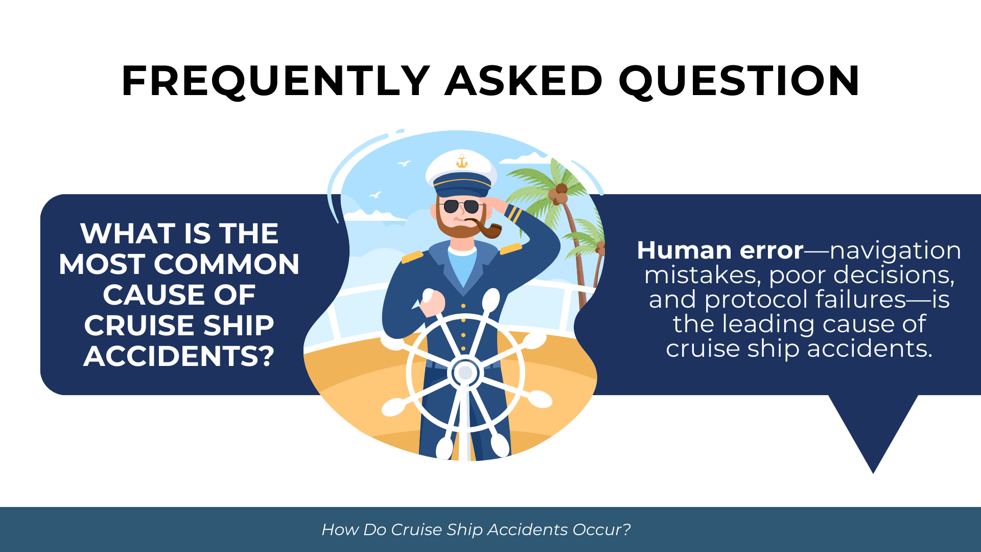Human error remains the primary contributor to cruise ship accidents. This includes navigation mistakes, poor decision-making during emergencies, overreliance on automation, and failures to follow established safety protocols. Even when mechanical systems fail, human responses typically determine whether the situation can be controlled.