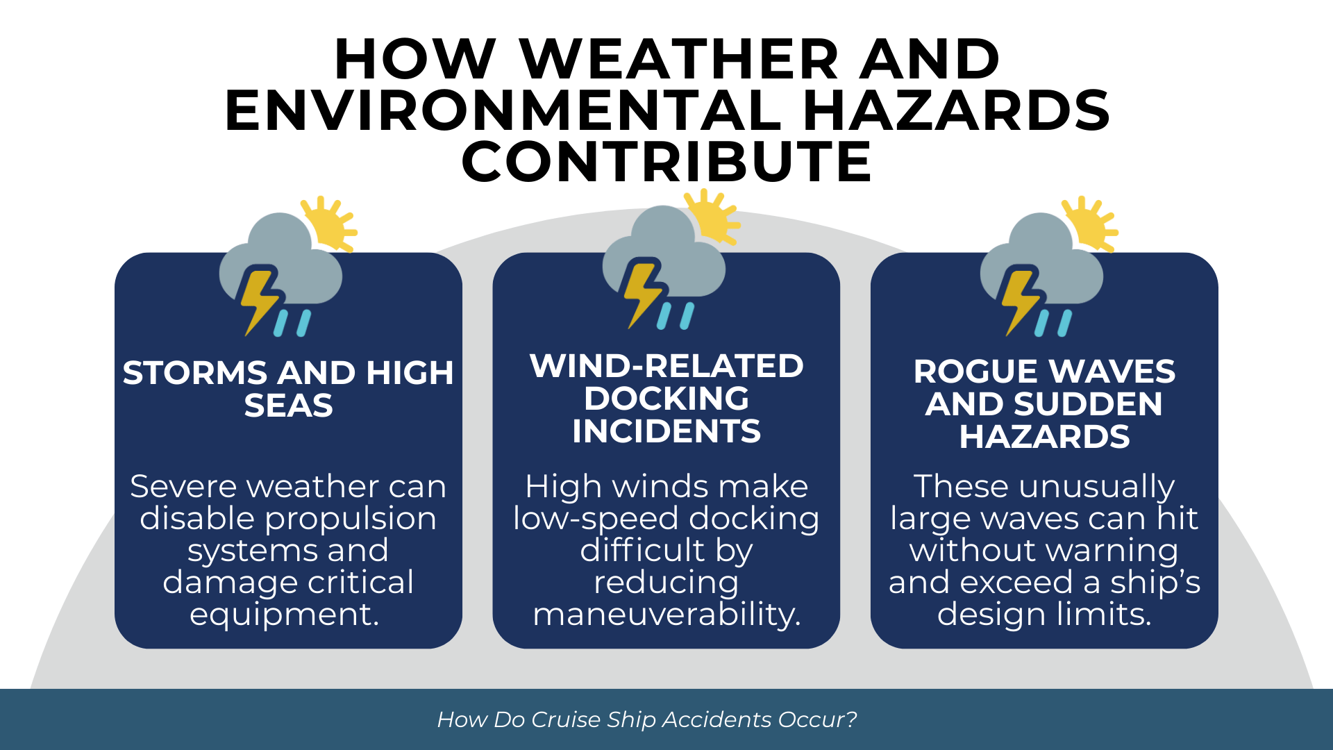 Severe weather can disable propulsion systems, damage equipment, and make navigation more difficult. High winds during docking operations have caused multiple pier collisions. Storms can stress mechanical systems to the point of failure. Rogue waves, though rare, have caused injuries and fatalities on cruise ships.