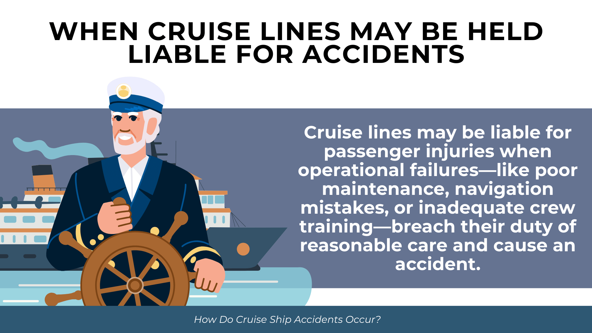 Cruise lines owe passengers a duty of reasonable care. This duty requires them to maintain vessels in safe condition, train crew members adequately, and operate the ship in accordance with maritime safety standards. When accidents occur due to failures in these responsibilities, the cruise line may be liable for resulting injuries.