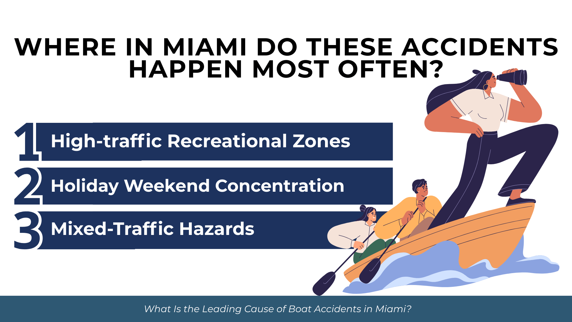 Popular recreational areas see the highest accident concentrations. Biscayne Bay, the waters around Key Biscayne, and the Intracoastal Waterway through Miami-Dade County all experience heavy traffic. These areas attract tourists, rental vessels, and experienced boaters simultaneously. The mix of skill levels creates unpredictable conditions where inattentive operators pose the greatest risk.