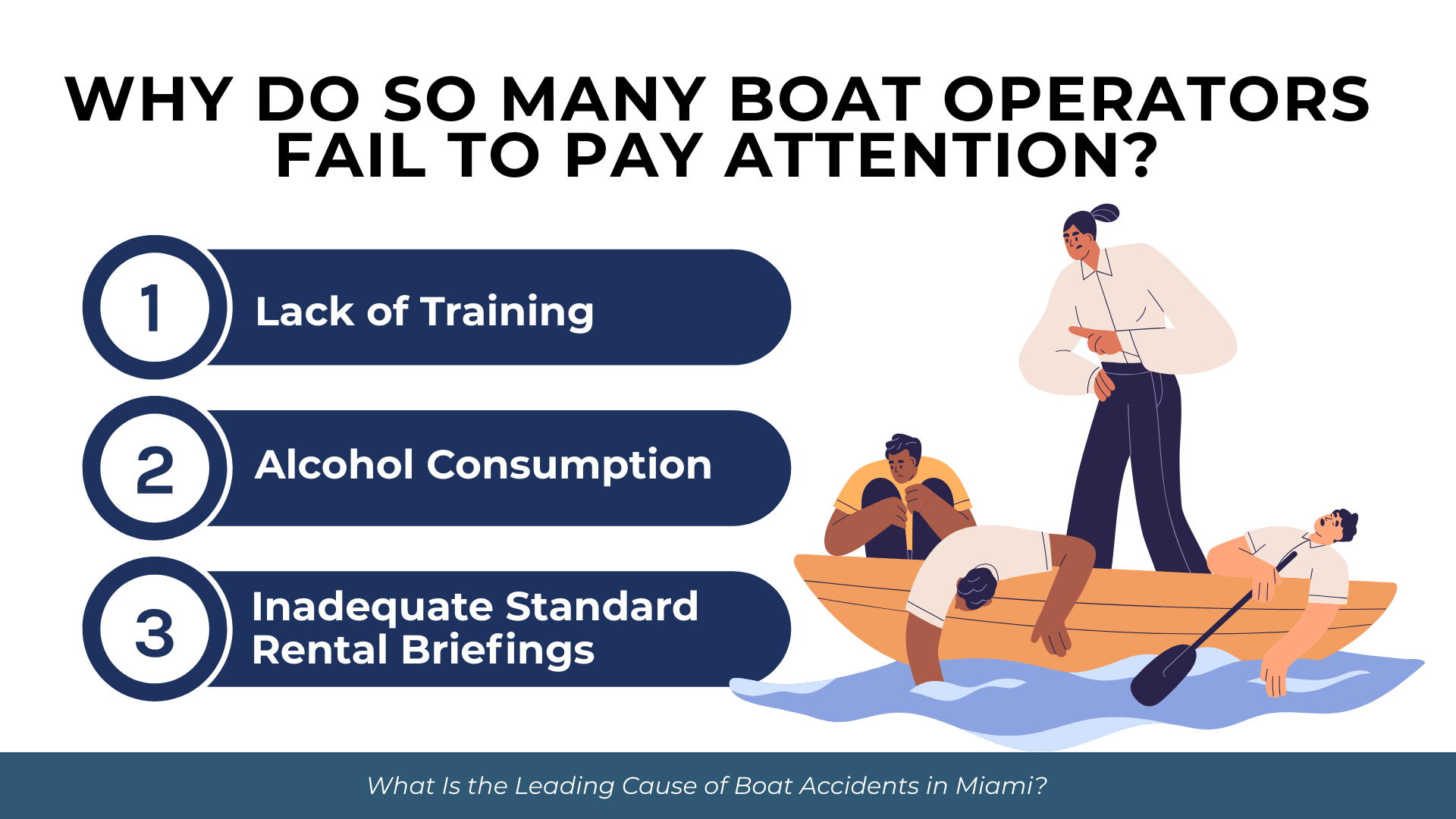 Several factors explain why operator inattention remains so prevalent on Miami’s waters. The combination of untrained operators, environmental distractions, and rental industry practices creates conditions where inattention becomes common.