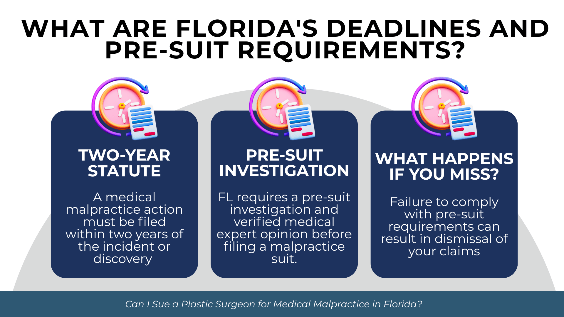Florida imposes a two-year statute of limitations from when you discovered or should have discovered the injury, and a four-year statute of repose from the date of the procedure. You must also complete a mandatory 90-day pre-suit investigation before filing, so you should begin the process well before the deadline approaches.