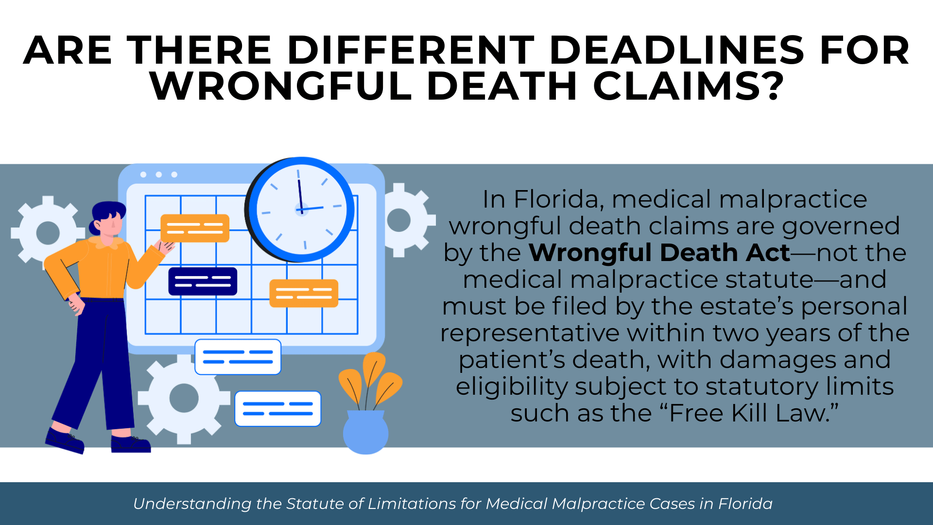 When medical malpractice results in a patient’s death, different timing rules apply to wrongful death claims. These claims are governed by Florida’s Wrongful Death Act rather than the standard medical malpractice limitations statute.