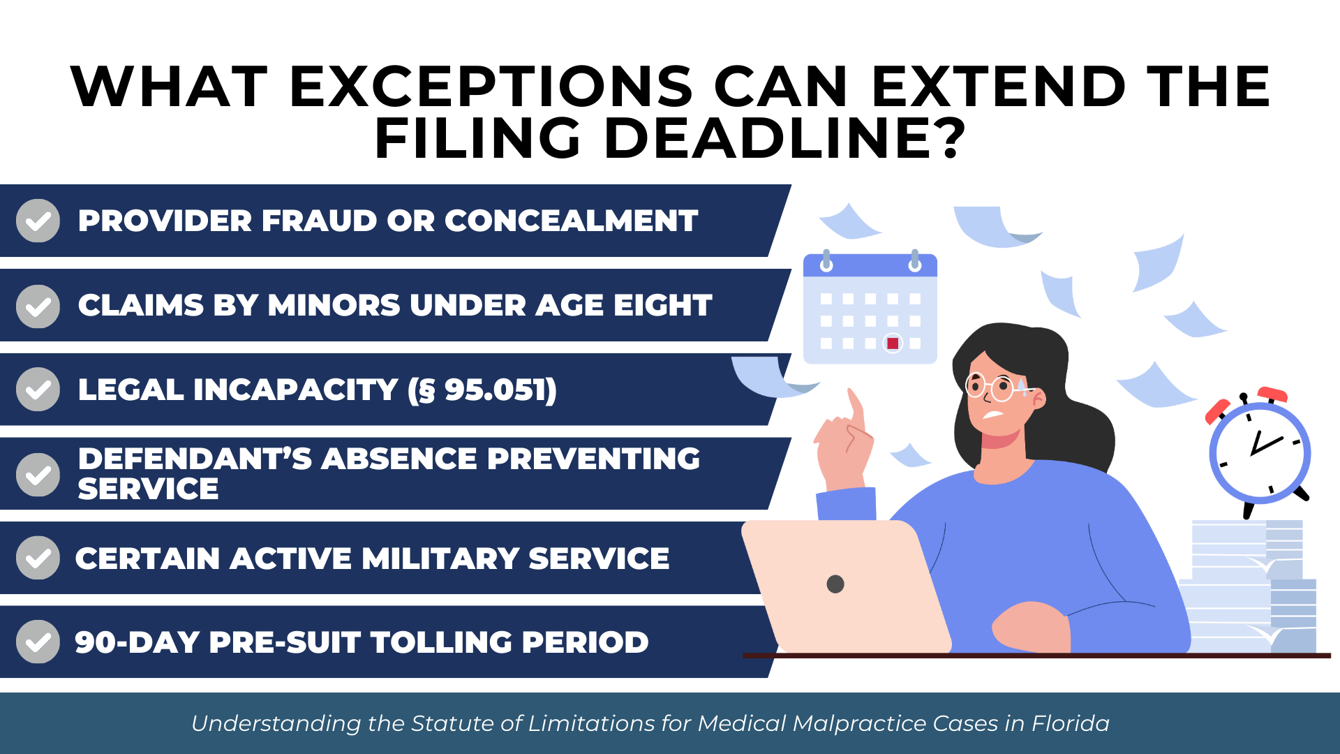 These two deadlines operate simultaneously, and the claim must satisfy both requirements. The following principles govern Florida medical malpractice filing deadlines: