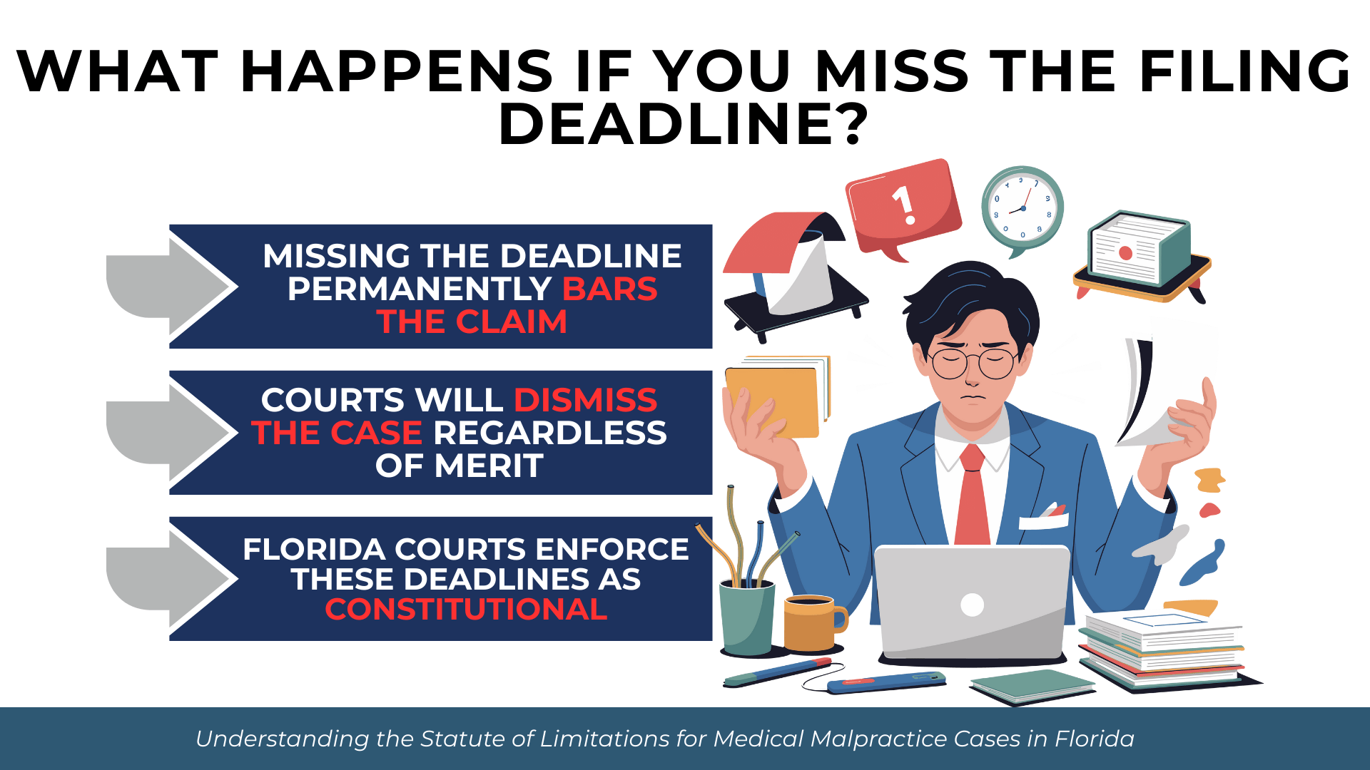 The consequences of missing the statute of limitations in Florida medical malpractice cases are severe and generally irreversible. Understanding these consequences underscores the importance of timely action.