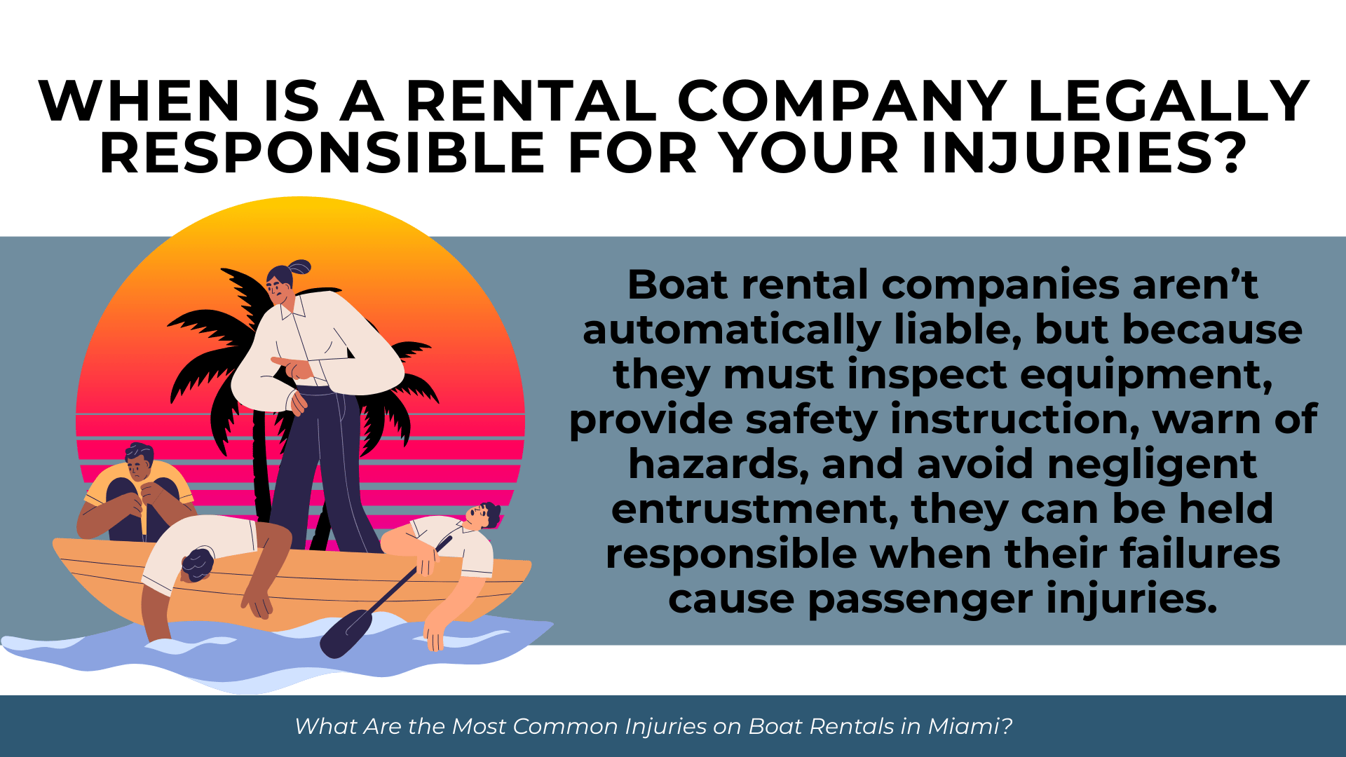 Rental companies are not automatically liable for every injury that occurs on their boats. However, they have specific duties under maritime and Florida law, and breaching those duties can create legal responsibility for passenger injuries.