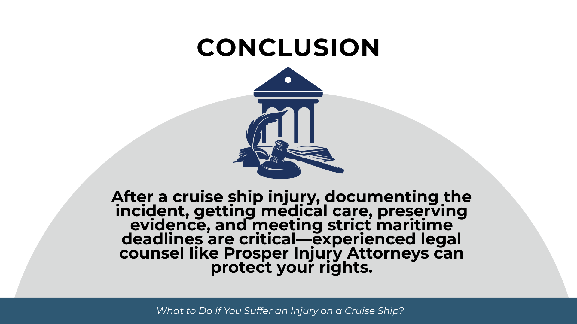 After a cruise ship injury, your immediate actions significantly impact your ability to recover compensation. Document everything, seek medical attention, formally request evidence preservation, and understand the strict deadlines that govern maritime claims. The complexity of federal maritime law and the cruise line’s aggressive defense tactics make experienced legal representation essential. Contact Prosper Injury Attorneys to discuss your cruise ship injury case and understand your options.