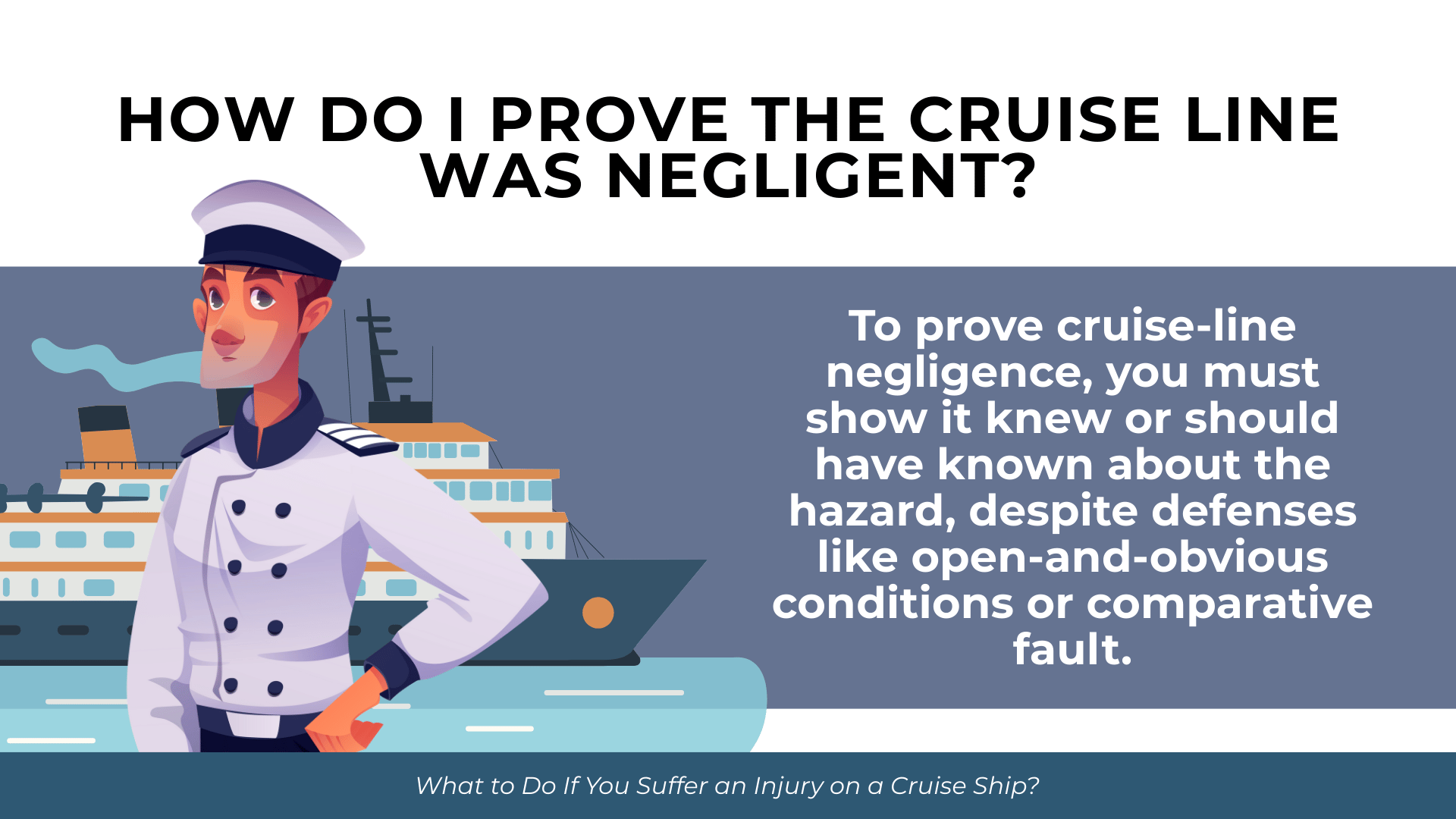 Proving negligence requires showing the cruise line had actual or constructive notice of the dangerous condition that caused your injury. This notice requirement, established in Keefe v. Bahama Cruise Line, 867 F.2d 1318 (11th Cir. 1989), is one of the most litigated issues in maritime law.