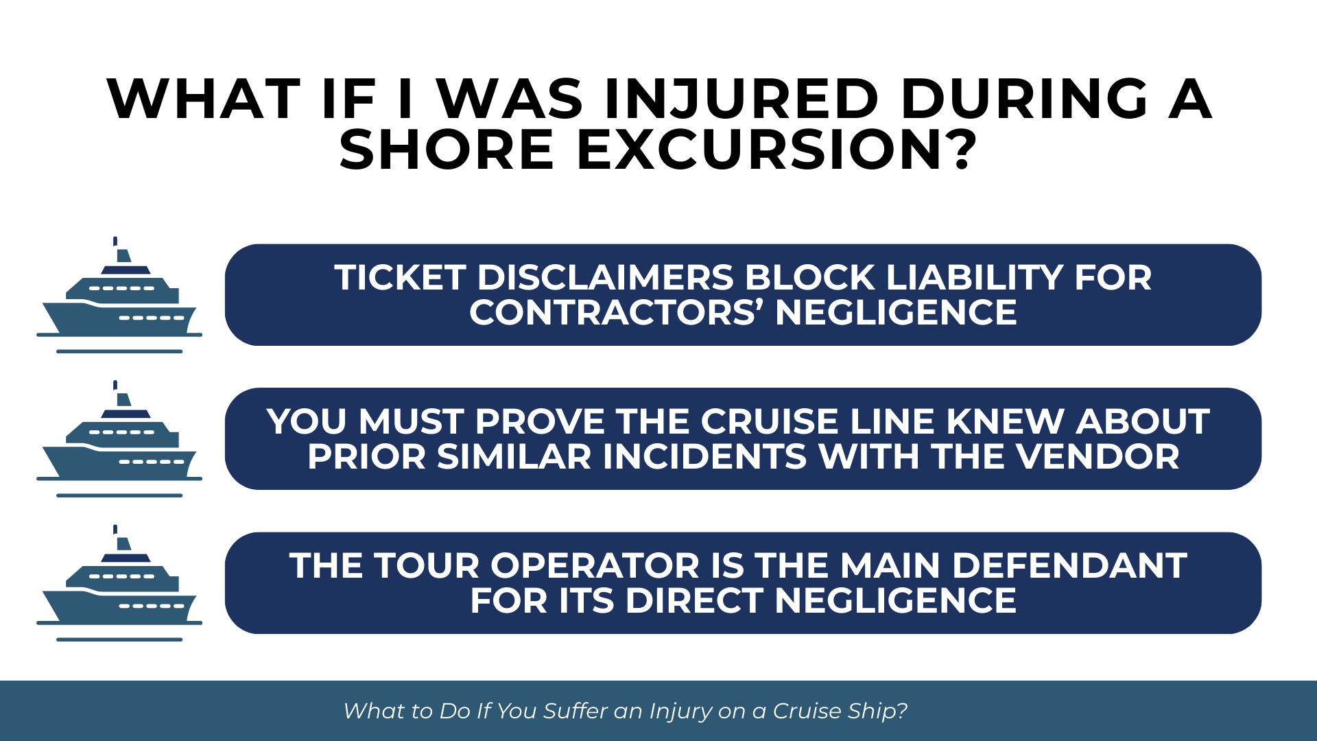 Shore excursion injuries involve different liability standards than shipboard accidents. Cruise lines typically aren’t responsible for injuries caused by independent tour operators but can face liability for their own negligence in selecting or monitoring vendors.