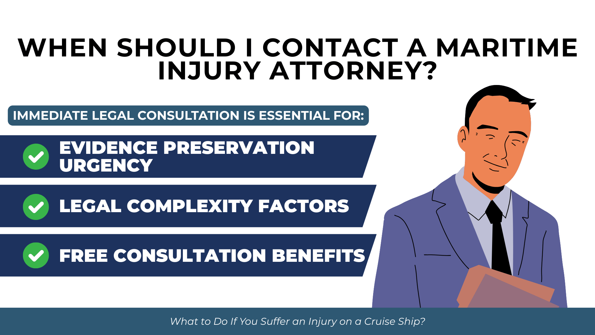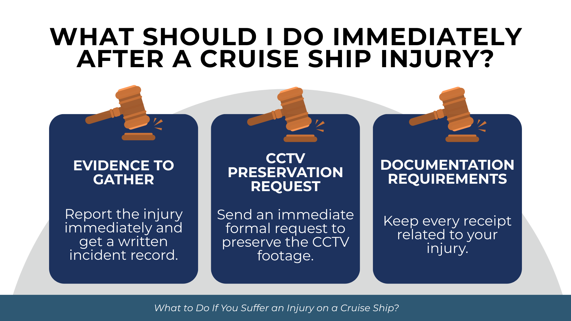 The first 24 hours after your injury are crucial for both your medical recovery and legal claim. Your immediate priority is documenting everything while evidence remains fresh and accessible. Most importantly, you need to act quickly because cruise lines often delete critical evidence within days.