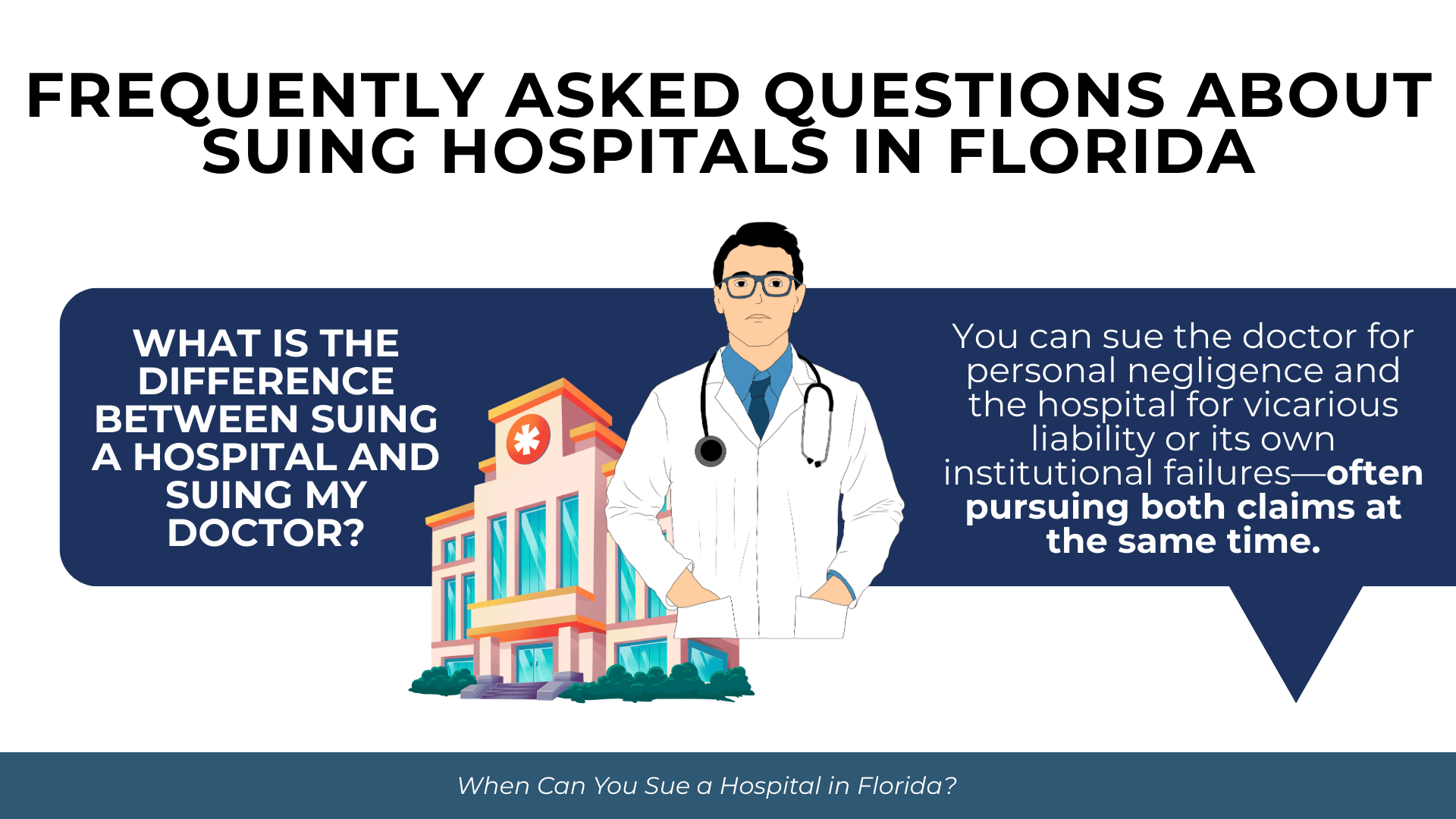 Suing the doctor targets their individual negligence in providing care. Suing the hospital targets either the hospital’s vicarious responsibility for its agents’ actions or the hospital’s own institutional failures in credentialing, supervision, or maintaining safe conditions. You can often pursue both claims simultaneously.