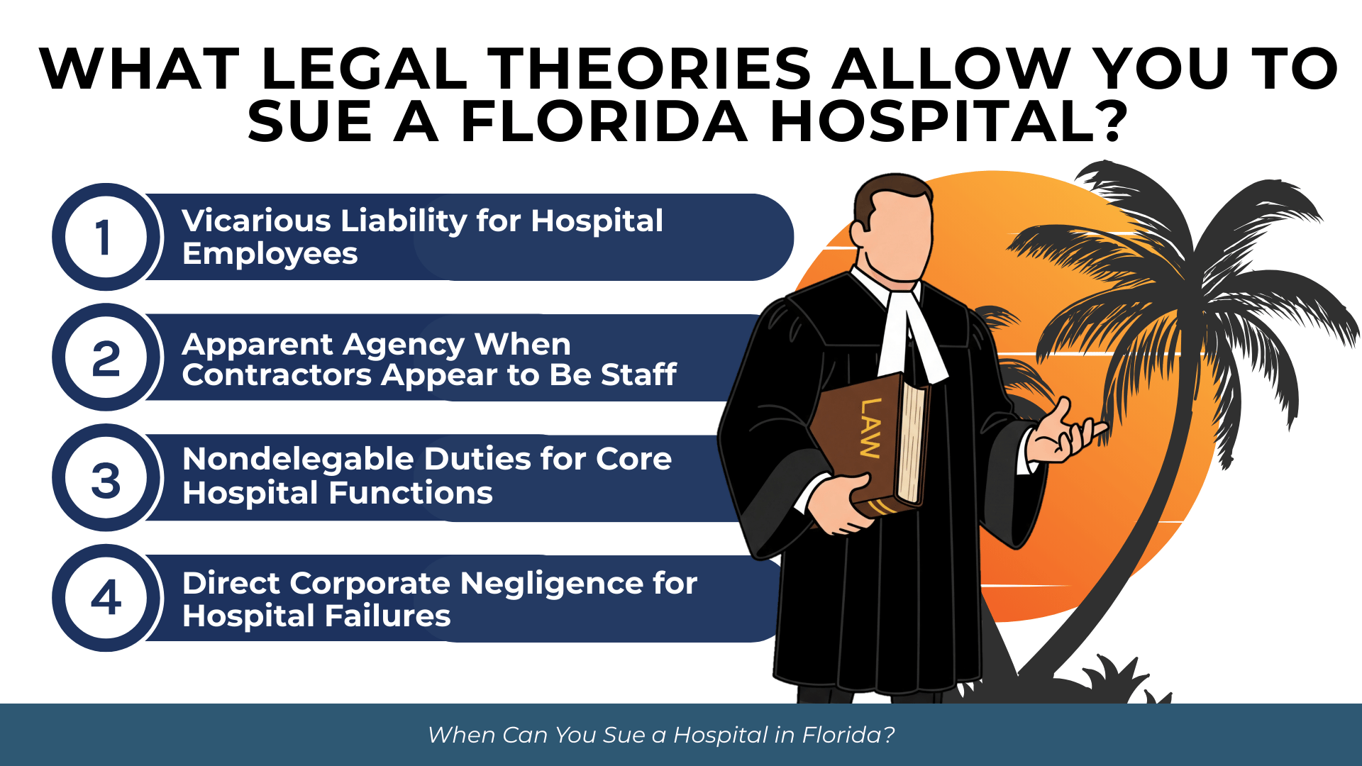 Florida law recognizes several distinct theories under which hospitals may be held liable for medical malpractice. Each theory has different requirements and applies in different circumstances.