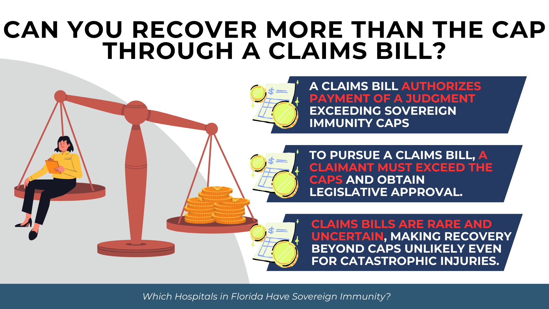For patients with catastrophic injuries, the claims bill process may be the only path to adequate compensation from a government hospital. But the uncertainty and length of the process—often taking years after the initial judgment—means that recovery beyond the caps is far from guaranteed.