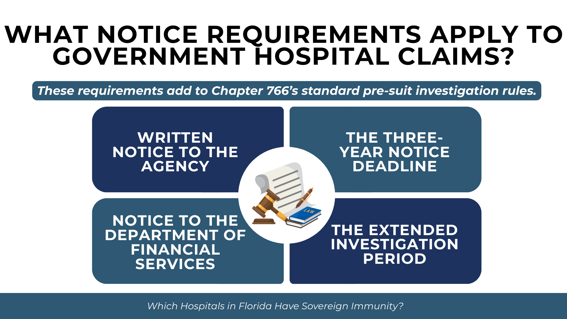 Before filing a lawsuit against a government hospital, Florida law requires strict compliance with pre-suit notice requirements. These requirements are in addition to the standard Chapter 766 pre-suit investigation requirements that apply to all medical malpractice claims.